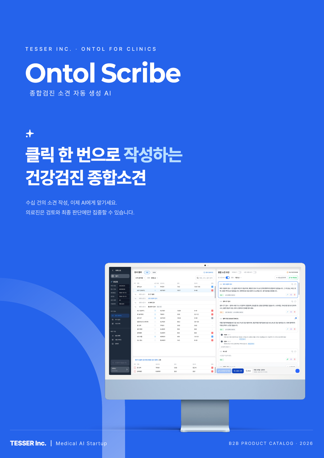 | (주)테서는 의료 AI 솔루션, '온톨(Ontol)'을 통해 환자와 병원을 AI로 연결하는 디지털 헬스케어 기업입니다. 국내외 14만 명 이상의 환자와 보호자가 사용하는 온톨은, 병원 데이터와 검사 결과를 AI 기술로 분석하여 환자 중심의 의료 서비스를 제공합니다. 전국 약 20개소 이상 주요 건강검진센터 업무 자동화 AI 솔루션, '온톨OS'를 제공하며, 병원 의료진과 실무자의 행정 업무 시간을 80% 이상 절감하는 성과를 보이고 있습니다. 테서는 70만 건 이상의 누적 의료 데이터를 기반으로 병원 운영 효율화부터 정밀 의료까지, 의료 산업의 디지털 전환(DX)과 AI 전환(AX)를 동시에 선도하고 있습니다. | ||